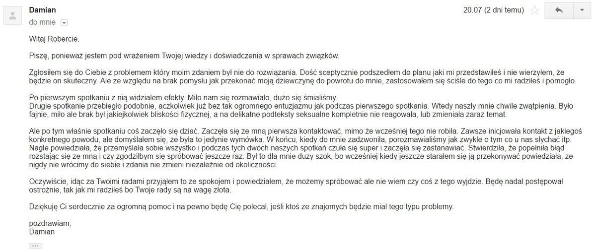 - Opieka doświadczonego trenera, który codziennie prowadzi konsultacje i pomaga klientom naprawiać związki i odzyskiwać byłych partnerów.