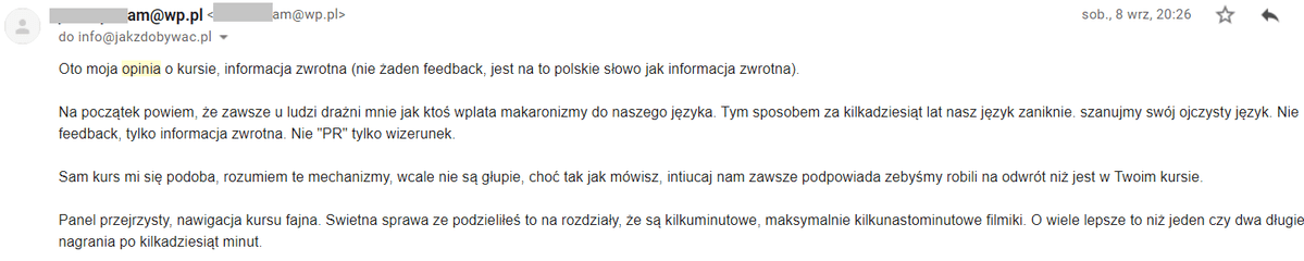 Jeżeli materiał zawarty w kursie Ci się nie spodoba, wystarczy jeden Twój e-mail na info@jakzdobywac.pl i w ciągu 24 godzin otrzymasz bezwarunkowy zwrot pieniędzy! Absolutne ZERO RYZYKA!