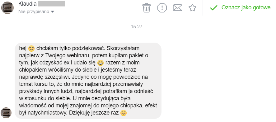 Dokładnie. I na tym właśnie polega strategia. Ex nie stara się o Ciebie, bo widzi, że ma Cię na wyciągnięcie ręki i to jest bardzo odpychające. Dopiero, kiedy staniesz się wyzwaniem i zadziałasz na emocje swojej/swojego Ex, będzie możliwe odnowienie kontaktu i obudzenie przygasłych uczuć.