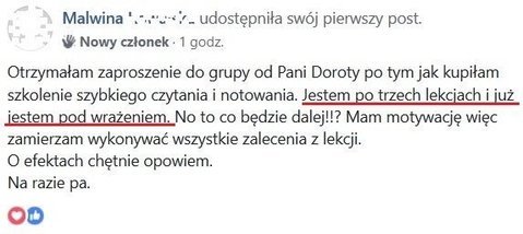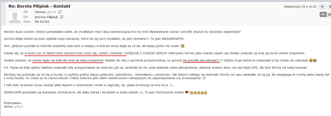 Kurs ma Ci pomóc przynajmniej podwoić tempo czytania ( są osoby których tempo wzrosło nawet 10-krotnie!). Jednak jestem w 100% pewna, że zauważysz znaczny wzrost koncentracji, zapamiętywania i zrozumienia. Nabędziesz lepsze nawyki nauki, pewność siebie i zaufanie do własnego mózgu.